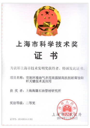石油鉆桿耐磨耐蝕及防刺漏技術(shù)上海市科學(xué)技術(shù)獎(jiǎng)二等獎(jiǎng)